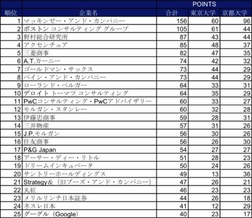 このランキング。何か強烈な違和感を感じないだろうか? ※「【東大京大・就職ランキング】P&Gが17位へ急落?マッキンゼー・BCGを辞退した学生は、どの企業へ進んだか。」より記事では50位まで公開 このランキングは、東大・京大の現役就活生の「人気企業ラ…